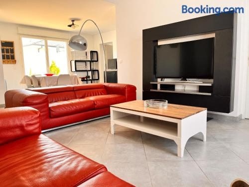 Villa clair logisはアンデルノ・レ・バンにある宿泊施設で、ラ・ジュテビーチまで徒歩7分、ラ・コクシネルまで32km、キッド・パークまで34kmです。庭、テラス、館内全域での無料WiFiを提供しており、庭の景色が望めます。 ベッドルーム3室、キッチン(冷蔵庫、食器洗い機付)、バスルーム(シャワー、ヘアドライヤー、洗濯機付)1室が備わる別荘です。薄型テレビが備わります。 Villa clair. ..