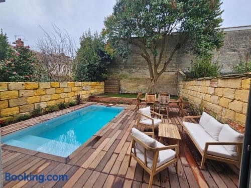 ボルドーにあるVilla Nomade - Bordeaux center 180m2, 4 rooms, Garden & Poolは、プールの景色を望むユニット(無料WiFi利用可)、季節限定の屋外プール、庭、テラスを提供しています。この別荘には専用プールもあります。 ベッドルーム4室、リビングルーム、設備の整ったキッチン(冷蔵庫、コーヒーメーカー付)、バスルーム(シャワー、ヘアドライヤー付)3室が備わるエアコン付きの別荘です。バスルームにはバスタブが備わります。 Villa Nomade. ..