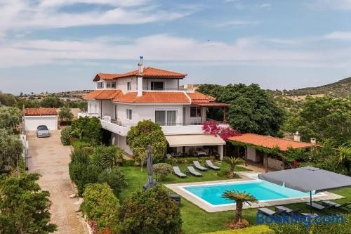 コロピオンにあるOlive Grove Villaは、海と山の景色を望むテラス、屋外プール、フィットネスセンター、ホットタブを提供しています。このカントリーハウスでは、専用プール、庭、無料専用駐車場を提供しています。 ベッドルーム4室、リビングルーム、設備の整ったキッチン(冷蔵庫、コーヒーメーカー付)、バスルーム(シャワー、ホットタブ付)3室が備わるエアコン付きのカントリーハウスです。薄型テレビが備わります。 Olive Grove. ..