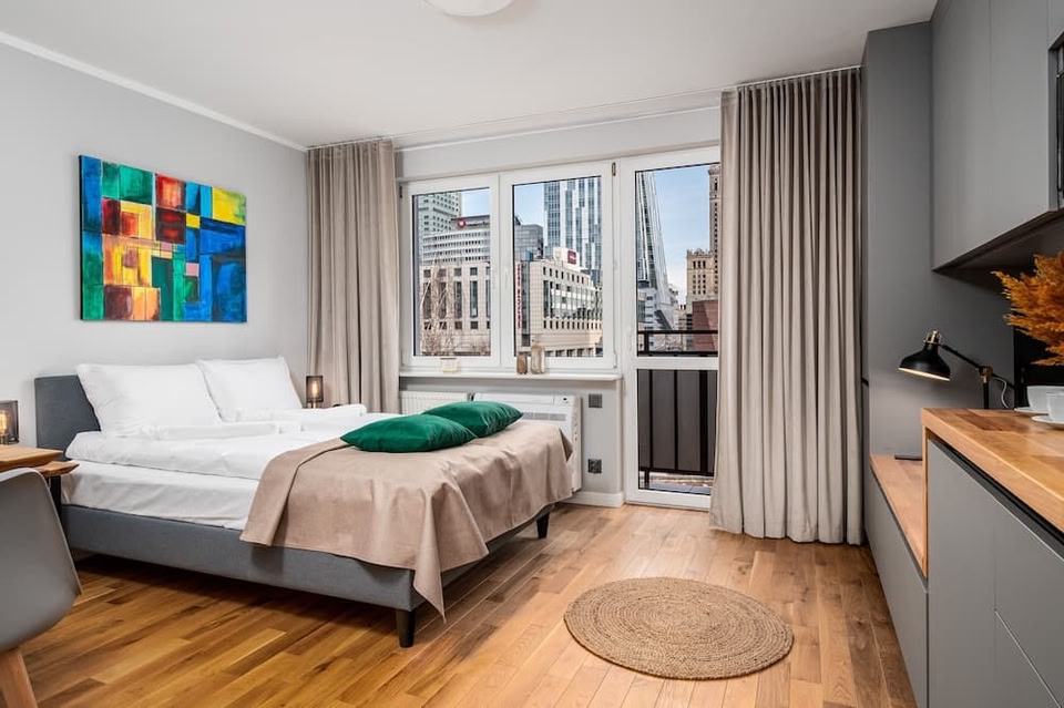 このアパートメントは、ワルシャワのツェントルム地区にあります。サスキ公園とガブリエル・ナルトヴィチ広場は地域の自然美が楽しめるスポット。フレデリック ショパン博物館やワルシャワ大学植物園も人気のスポットです。コペルニクス科学センターとルーム エスケープ ワルシャワも訪れる価値のあるスポットです。 ワルシャワに位置する、この快適なアパートメントの近くでは、さまざまなアクティビティが楽しめます。文化科学宮殿まで徒歩 11 分、ワルシャワ技術博物館へは徒歩 9 分です。ワルシャワ・シロドミエシチェWKD駅 (徒歩 4 分) やワルシャワ中央駅 (徒歩 6 分) から電車に乗って、近くのスポットまで足を伸ばすこともできます。調理ができる簡易キッチンがあり、コンロ、冷蔵庫、食器洗い機、電気ケトル、調理器具、トースターが備わっています。WiFi (無料)にアクセスしたり、薄型テレビの前でリラックスしたりして過ごせます。浴室には、ヘアドライヤーとタオルが備わっています。この宿泊施設 (1 ベッドルーム、1 バスルーム) には、その他の設備やサービスとして、ベッドシーツ、アイロン台、暖房、ワードローブ / クローゼットがあります。