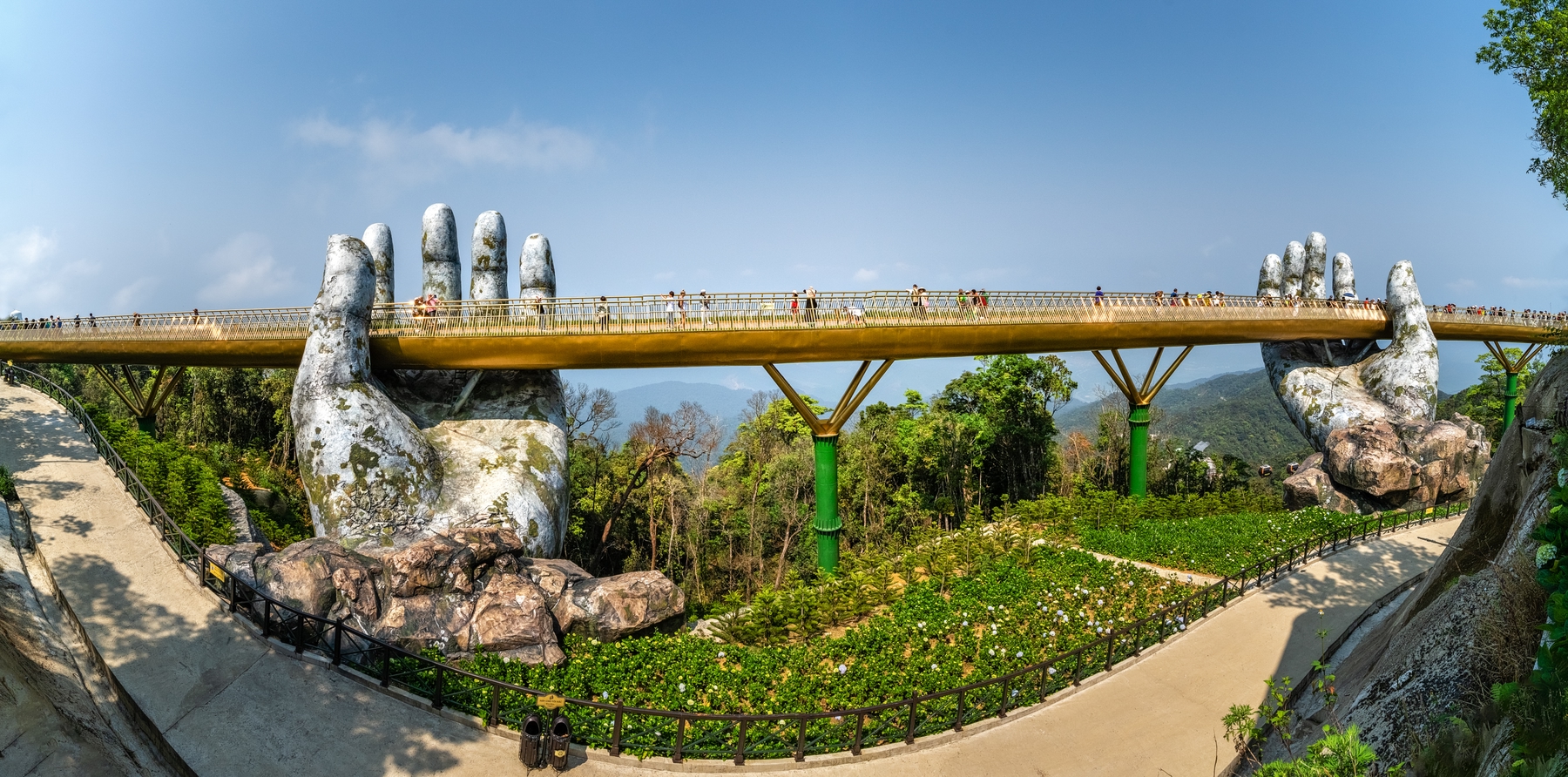 ダナンといえば、巨大な手が橋を支える「ゴールデンブリッジ」がSNSを中心に話題を集めています。ここは、市街地から車で約1時間、避暑地として知られていた山岳地帯に位置するテーマパーク「バーナヒルズ」内にあり、2018年にお披露目された比較的新しい橋です。圧倒的なインパクトを誇る橋を渡りながら、開放感のある景色も楽しみましょう!