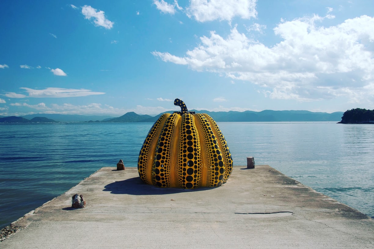 岡山市の宇野港からアクセスできる瀬戸内海に浮かぶ直島は、アートの島として国内外から注目を集める島。島内には野外に設置された芸術作品や美術館が点在し、直島独特のコンテンポラリーな世界観が漂います。特にアイコニックな屋外アート作品は、ベネッセハウスミュージアム近くの海沿いに佇む「南瓜」や、海の駅の近くにある「赤かぼちゃ」。ビビットなカラーで水玉模様が描かれる草間彌生さんの存在感を放つオブジェが島の雰囲気に映え、写真スポットとして人気です。