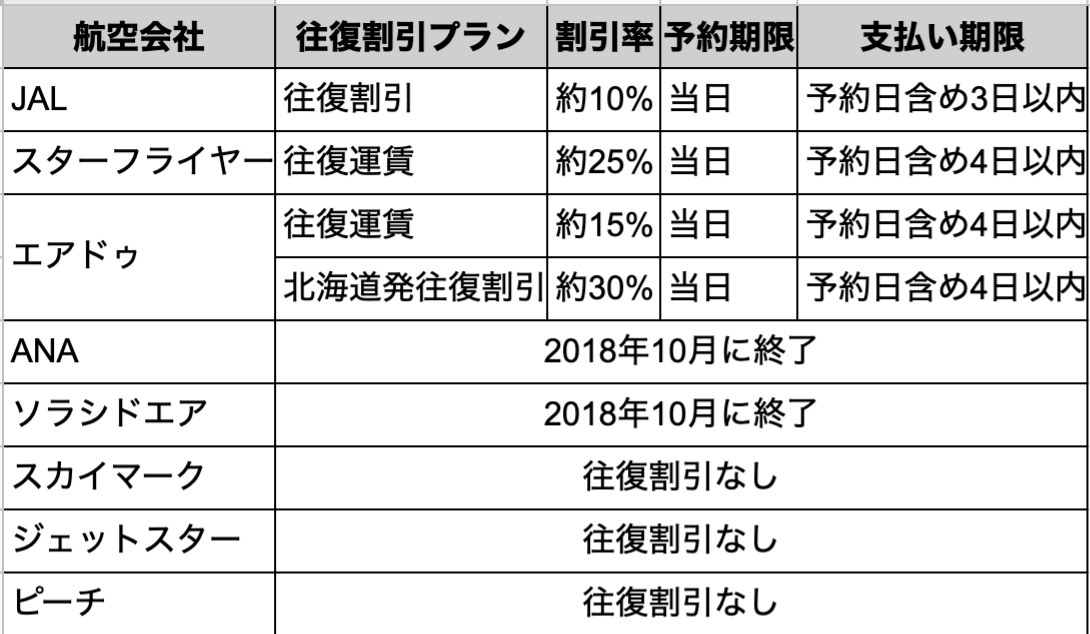 各航空会社の往復割引一覧