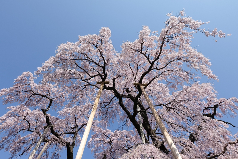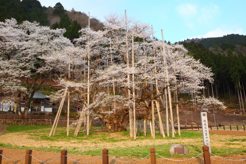日本最古で最大のエドヒガンザクラ。樹齢は1,800年とも2,000年とも言われ、ヤマトタケルノミコトが東夷征定の際この地に留まり、記念にこの桜を植えたという伝承が「神代」という名前の由来となっています。日蓮宗の実相寺にあるこの桜は、衰えた神代桜を日蓮が祈りで再生させた、という伝説も残っています。樹高10.3m、根元・幹周りは11.8mもあり、日本で最古・最大級の巨木のその逞しさは、私たちにも力を与えてくれそうです。