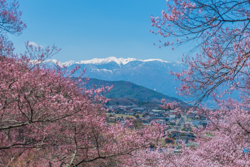 高遠の桜は、「天下第一の桜」と呼ばれています。戦国時代から江戸時代にかけて、武田信玄の家臣である山本勘助が治めた城下町でしたが、明治時代の廃藩置県により、高遠城は撤去され、公園となりました。園内には約1,500本以上の「タカトオコヒガンザクラ」が咲き乱れます。その中には樹齢100年を超えるものも。この「タカトオコヒガンザクラ」は高遠にしか咲かないと言われていて、長野県の天然記念物に指定されています。ソメイヨシノより、少し小さく、赤みの強く鮮やかな色が特徴です。城跡だということでも分かるように、高低差がある公園に咲く桜を上から眺めたり下から見上げたりと様々なアングルで楽しめるほか、中央アルプスとのコントラストも素晴らしい眺めです。